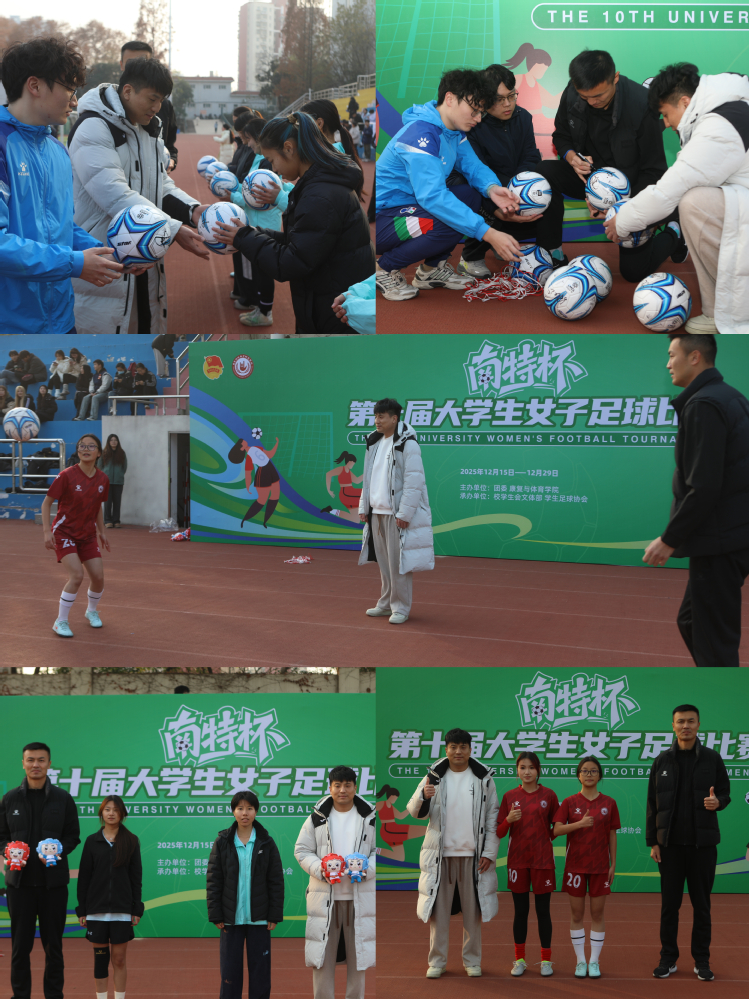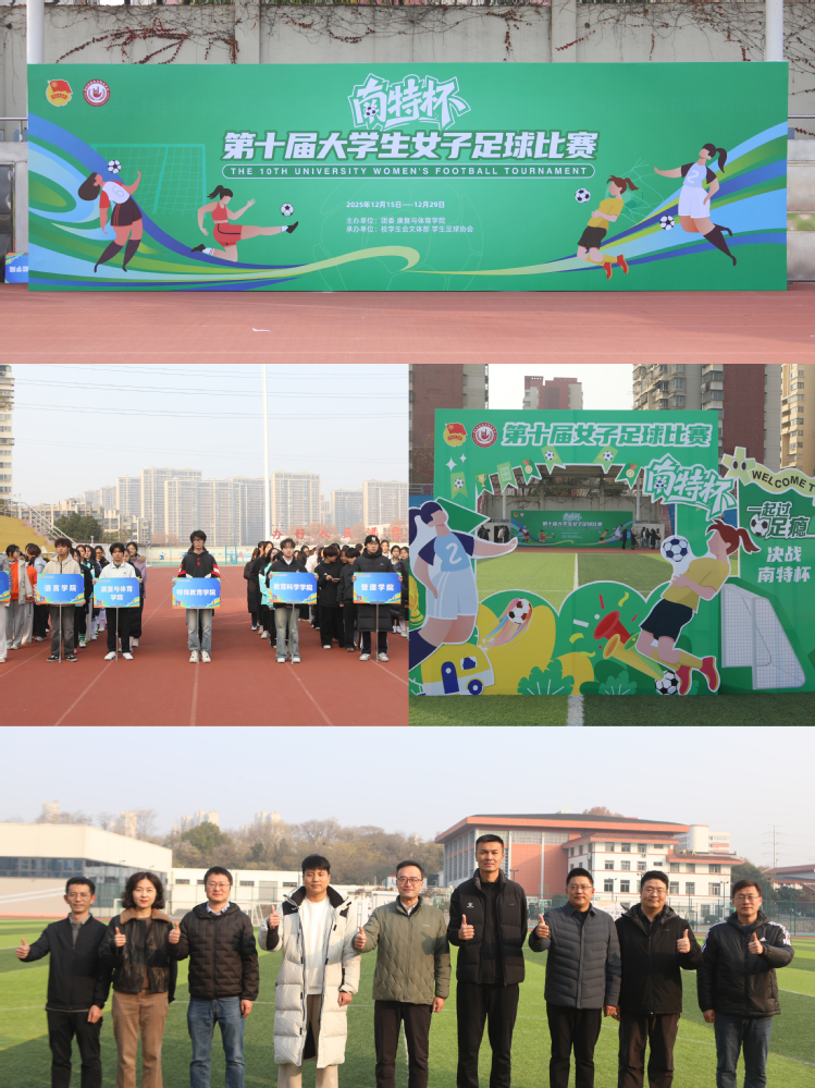 2025年12月17日下午,“南特杯”第十届大学生女子足球比赛开幕式在我校栖霞校区足球场隆重举行。校党委常委、副校长高飞,体育学院、教科院、学生工作处、团委相关负责人、各学院师生代表共同出席,开幕式特邀“苏超”南京队球员戈伟、姚远参加现场活动,来自全校7个学院的女子足球队齐聚绿茵场,展现青春风采。