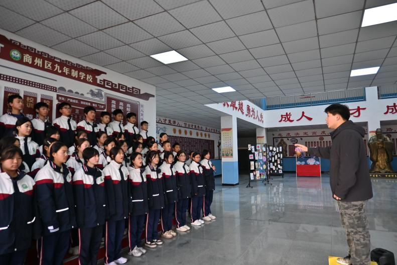 汇报会前夕,师生们精心筹备的成果展在商州区九年制学校精彩呈现。来自商州区九年制学校、商洛市特校、山阳特校等院校的学生作品错落陈列,笔墨间凝结着孩子们的奇思妙想,更镌刻着支教实习生的心血浇灌,成为跨越地域的教育共鸣。音乐与舞蹈学院张雨霁同学带领30名初二学子唱响红色经典《横断山,路难行》,激昂旋律回溯革命岁月,让红色基因在歌声中代代相传,尽显支教带来的精神滋养。