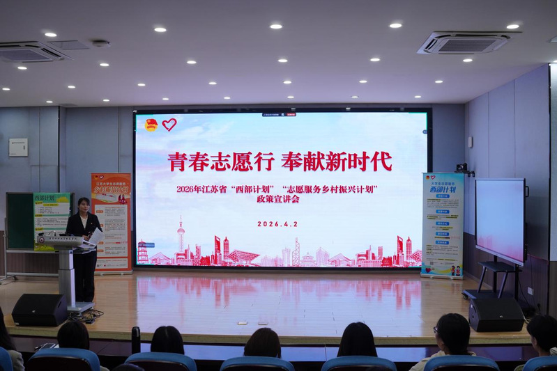 为深入贯彻全国两会精神与“十五五”乡村振兴人才工作要求,落实共青团中央、江苏省委关于促进高校毕业生高质量基层就业部署,引导2026届毕业生将个人理想融入国家发展大局,主动投身基层、服务乡村振兴,2026年4月2日14:00,校团委在栖霞校区博远楼106成功举办西部计划、江苏省大学生志愿服务乡村振兴计划专题宣讲会。校团委相关负责老师、毕业班辅导员及百余名毕业生代表参加活动。
